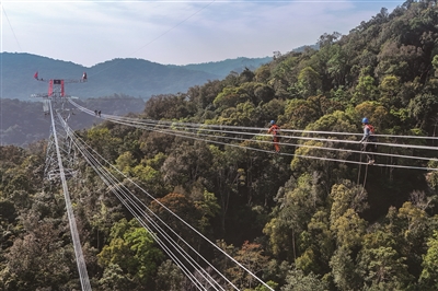 2月5日,中老500千伏联网工程中国段和老挝段输电导线在中国云南省磨憨与老挝磨丁交界处实现物理连通。据介绍,中老500千伏联网工程线路总长177.5千米,其中,中国段长145千米,老挝段长32.5千米。工程投运后,预计可具备150万千瓦双向送电能力。这是施工人员分别从位于中国和老挝境内的铁塔相向出发,前往线路连接点汇合(无人机照片)。
