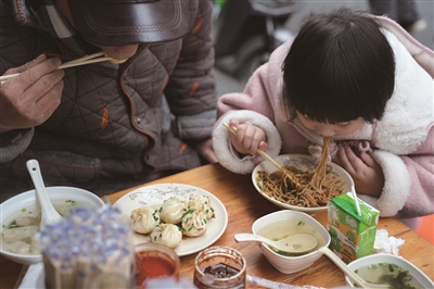 这是一家典型的夫妻店。丈夫在后厨负责做煎包,妻子在前厅招呼客人、打包收钱,两人都是安徽人。老板儿子李健从小就在店里长大,“从我记事起家里就做这个生意,每天天不亮爸妈就起来了,一个在里头包,一个在外头卖。”李健说。