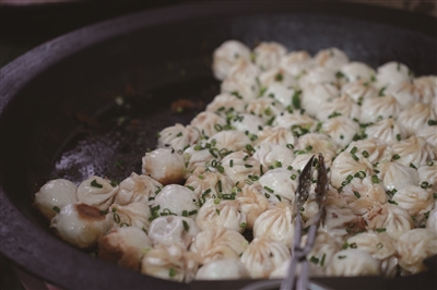 老板的手很巧,包出来的煎包个个大小匀称。一锅煎包要煎六分钟,时间一到,掀开盖子,热气腾起,此时混着热气撒下一圈葱花,便可出锅。煎包的底煎得金黄焦脆,即便放凉一会再吃,咬下去依旧能听到清脆的“咔嚓”声。