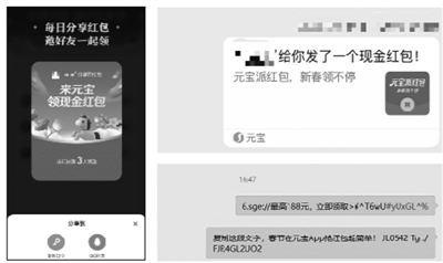 左图为元宝APP中红包分享页面改为“复制口令”和分享到“QQ好友”两种形式。 右上图为元宝的红包分享链接在QQ群聊中可以正常打开。 右下图为文心和元宝的红包链接在微信群聊中都被修改成了复制口令的模式。