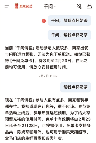 AI红包大战让外卖崩了 千问再次延长免单卡期限