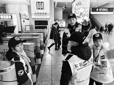 大小志愿者们分组穿梭在人来人往的火车东站。