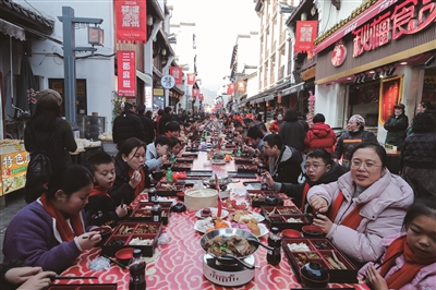 2月11日,当地群众与各地游客在古街围坐长桌,品尝美食。当日,一场名为“马上‘宋’福——严州包子宴”的千人长桌宴在浙江省建德市梅城镇严州古城开启,千余名当地群众与各地游客在古街围坐长桌,提前拥抱团圆年味。