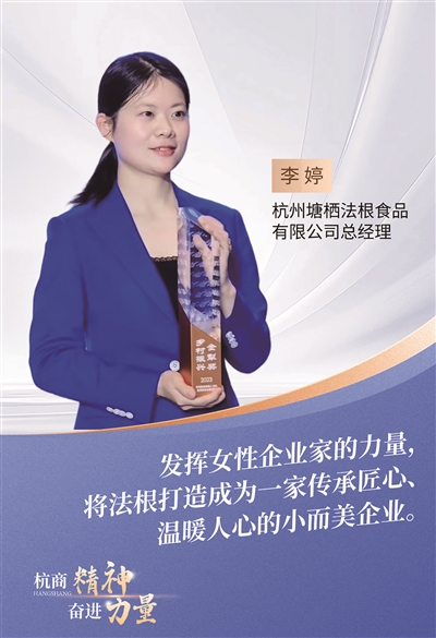 作为法根糕点第三代传人,李婷于2016年接过父亲李法根的担子,担任杭州塘栖法根食品有限公司总经理。十年来,她用一块小小的糕点,讲述着中华优秀传统文化的魅力故事,还在实践中探索出一条以产业带动共富、助力乡村振兴的扎实路径。对李婷而言,经营企业不只是商业行为,更是一份沉甸甸的文化传承与社会责任。