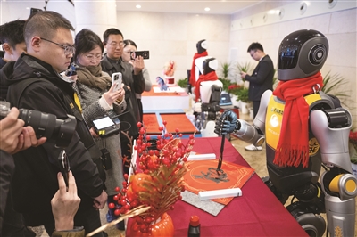 2月24日,人形机器人在现场进行书法表演。当日,湖北自主研制的多款eVTOL(电动垂直起降飞行器)航空器以及人形机器人在“全省加快建成中部地区崛起的重要战略支点推进大会”上亮相,集中呈现湖北低空经济、人工智能等产业的最新研发成果。