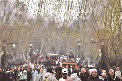 昨天西湖白堤的柳树已经吐露新芽。商报记者 严嘉俊 摄