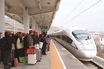 2月25日,来自甘肃省定西市的500余名务工人员,搭乘G2096次务工专列前往山东省青岛市。据悉,今年是“鲁甘人力”协作机制下连续六年开行“点对点”免费返岗务工专列,这是甘肃省春节后开行的首趟返岗务工专列。这是返岗务工人员在甘肃定西北站准备乘车。