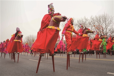 2月26日,河北省石家庄市灵寿县举办2026年新春民间艺术巡游展演活动,慈峪抬阁、得胜鼓、跑旱船、秧歌、高跷马等经典民俗节目轮番登场,十几支民间艺术队伍齐聚一堂,用地道的民俗风情为群众送上新春祝福。这是民俗艺人在巡游展演活动中进行高跷马表演。