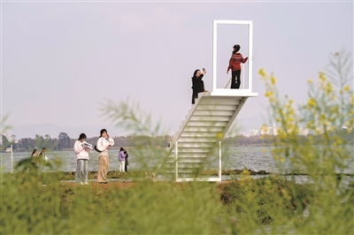 2月26日,游客在昆明滇池边一处拍照装置拍照。春日暖阳下,昆明滇池碧波荡漾,远山如黛,红嘴鸥翩跹起舞。游人沿岸漫步、驻足拍摄,共绘出一幅生动宜人的春游画卷。