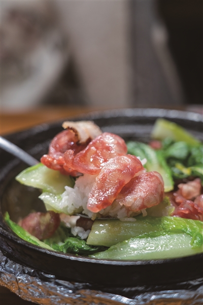 腊味煲仔饭端上桌时,砂锅还冒着热气,腊味的浓香瞬间扑面而来。腊肠和腊肉的分量超足,切片铺在米饭上,油脂慢慢渗进米粒里,每一粒米都裹上了腊味的香,底部结着一层金黄的锅巴,这是广式煲仔饭的灵魂,挖一勺带着锅巴的米饭,嘎嘣脆的口感混着软糯的米饭,越吃越香,腊味的咸香在嘴里久久不散。