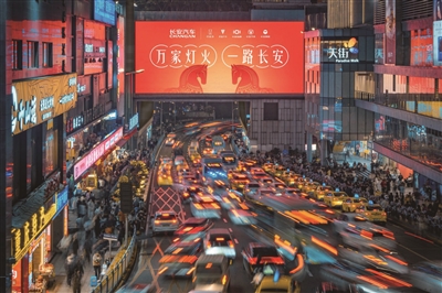 在重庆,这座长安汽车的根脉之地,一场场视觉盛宴轮番上演。从2月15日腊月二十八到3月3日元宵,重庆两江四岸核心区低空空域,长安汽车春节无人机秀持续点亮夜空。从五大品牌集体贺岁到各品牌依次登场,璀璨的无人机编队在夜空中勾勒出长安的品牌标识与新春祝福,成为重庆春节最亮眼的风景。与此同时,长安汽车“承包”重庆WFC、江北嘴十联屏、观音桥、解放碑等核心商圈网红大屏,从除夕到初三,五大品牌logo、车型混剪、暖心祝福轮番展示,“万家灯火一路长安”“温暖回家路 长安不打烊”等标语,让山城的街头巷尾充满长安温度。