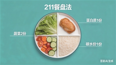 1.学习“211餐盘法”。每餐保证2拳蔬菜(非淀粉类)、1拳优质蛋白(鱼、虾、去皮的鸡肉和鸭肉、豆制品等)、1拳主食(优选糙米、燕麦、红薯、玉米等全谷物)。