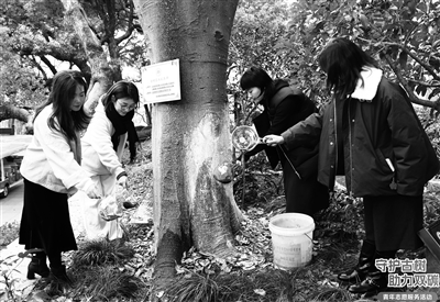 绿树掩映,繁花飘香。志愿者漫步古树群下,开展了沉浸式志愿服务实践。他们在专业人员指导下,为古树悬挂保护标识牌,学习基础养护知识,亲手为认养的古树浇水,并利用手机为古树建立可视化电子档案。理论结合实践,知识付诸行动。“看,这是我做的植物冰箱贴,采用了‘中国风’设计。”志愿者争相展示自己利用收集到的植物标本,亲手制作成的古树文创冰箱贴,让“变废为宝”的环保理念与志愿精神深度融合。