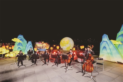 五彩斑斓的花灯令人惊艳:腾飞的骏马、古代建筑、插花工艺灯……造型精美。滨水舞台边,大型船灯、月亮灯倒映水中,宛如画卷。