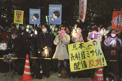 3月10日,在位于东京的日本国会门前,民众手持标语参加抗议活动。当晚,近万名日本民众参加在日本国会门前举行的抗议集会,反对高市政府近期推进导弹部署、扩大武器出口等危险政策,表达对日本未来道路的担忧。