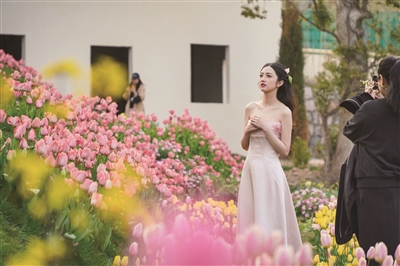 昨日,位于西湖区灵山中路108号的一处花园秘境,吸引众多游人前来拍照。它是一处由山坡式郁金香花海和欧式建筑等组成的花园,园内种有五万余株花卉,目前花海正值最佳观赏期,其浪漫唯美的花境成为春日中一道亮丽的景观。 商报记者 项凯 摄影报道
