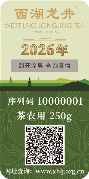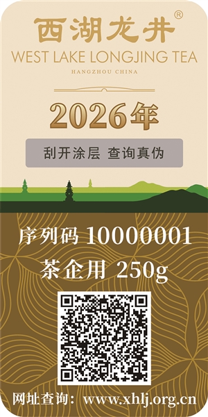 除了实打实的工作成效,西湖龙井茶的防伪溯源专用标识也有了新变化。作为每年都会优化调整的品牌细节,今年的茶标格外注重质感打磨,在2025年的基础上进一步打磨细节,从字体到背景,每一处设计都彰显着千年名茶的高端质感与文化底蕴。