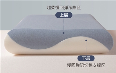 上层是“超柔慢回弹深陷区”,触感柔软,能很好地包裹头部;下层是慢回弹支撑层,负责稳稳托住颈椎。上下两层都是记忆棉材质,但密度不同,支撑性也不同。“上层柔软释压,下层稳托支撑,这种组合让睡感实现了质的飞跃。”小江说。