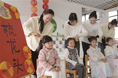 3月20日,在河南省济源市第一幼儿园“二月二龙抬头”主题活动中,老师给小朋友“梳龙头”。当天是春分节气,也是农历二月初二,各地开展丰富多彩的活动,欢庆“双喜临门”。