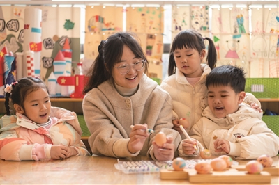 3月20日,江苏省泰州市御园路幼儿园的老师指导小朋友绘制彩蛋,准备进行春分立蛋活动。