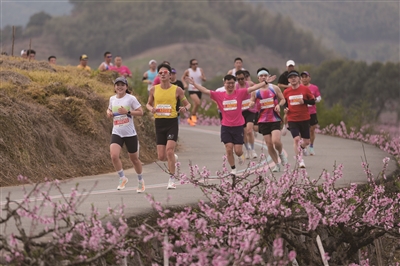3月22日,2026奉化马拉松在宁波市奉化区开跑,吸引约13000名跑步爱好者参赛。这是参赛选手经过奉化区萧王庙街道林家村的一片桃园。