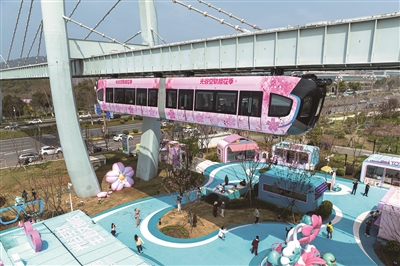 3月21日,一列空轨列车在运行中。近日,湖北发布中国光谷科技旅游线路,推出超级工厂线、人工智能线和低空文旅线三大主题科技旅游线路。这些线路依托光谷领先的光电子信息、人工智能、智能制造、低空经济等产业优势,将科创与文旅观光融合,方便游客近距离体验。