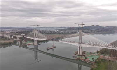 3月25日,在成达万高铁嘉陵江特大桥施工现场,最后一段钢箱梁吊装施工中。当日,成都至达州至万州高速铁路(简称成达万高铁)全线控制性工程嘉陵江特大桥顺利合龙,为成达万高铁按期通车奠定了坚实基础。嘉陵江特大桥位于南充市顺庆区与高坪区交界处,是成达万高铁全线“3隧4桥”重难点控制性工程之一。