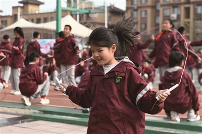 3月26日,在山东省日照市莒县第一实验小学,同学们在进行阳光大课间活动。为增强学生体质,莒县第一实验小学在保留上午大课间的基础上,增设了下午30分钟阳光大课间,让孩子们“身上有汗、眼里有光”,健康成长。