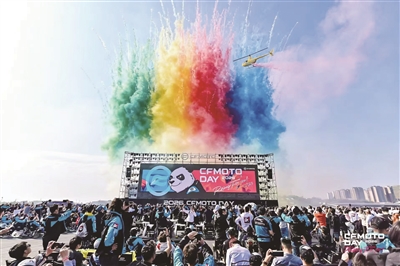 在亚摩联A级赛道成都天府国际赛道上,引擎声响彻全场。约300名骑行爱好者驾乘春风车型,在直升机彩烟领航下巡游,轰鸣声与欢呼声交织,点燃蓉城赛道。此外,本届活动赛道体验人数创历史新高,700余名车友亲身体验了顶级赛道竞速的快感。赛道体验时长也从往届1天延长至1.5天。商报记者 朱荣