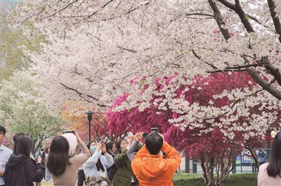 一园藏四季,武林揽芳华。这几天,拱墅区的万向公园,因其“四季同框”在社交媒体上火爆出圈。小小的公园内,樱花、美人梅、海棠、红花檵木、鸡爪槭同时绽放,绯红、粉红、橙黄、雪白交织,深浅相映,明艳动人,几乎齐聚了杭州所有的春日顶流。漫步其中,仿佛置身一场春日盛会,一步一景,满眼皆诗,让人沉醉。图为昨天,游客在万向公园内争拍旖旎春色。