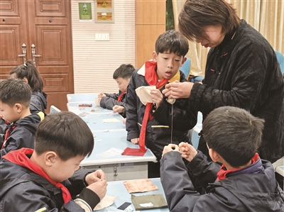 这场静悄悄的活动,是富阳博物馆的明星研学课程——经纬交织。虞老师告诉记者,经纬交织课程以创新形式传承富阳本土非遗,共包括手缝布艺、立体衍纸、手鞠球首饰设计、棒针编织等4个课程,平时都是在富阳博物馆内的工作室中可以参与实践,此次是第一次走进学校课堂。