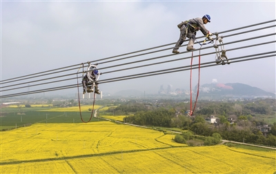 4月1日,在安徽省芜湖市繁昌区境内,安徽送变电工程有限公司施工人员在甘肃—浙江±800千伏特高压直流输电工程施工现场作业(无人机照片)。近日,电力工人抢抓春季有利天气,奋战在该工程施工建设一线,保障能源通道重点工程进度。工程线路全长2370千米,贯通后每年可输送电能约360亿千瓦时。