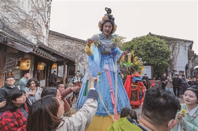 4月1日,嘉兴桐乡市乌镇香市轧蚕花活动启幕。身着传统服饰的蚕花仙子巡游队伍进行水上及古街巡游,重现古镇春日“蚕花仙子巡游、乡民踏春祈福”的经典场景。这是参加蚕花盛会的巡游演员在古镇的街市上与游客互动。