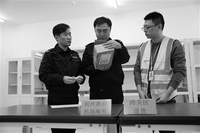 杭州萧山机场海关关员对退运入境的跨境电商商品进行监管