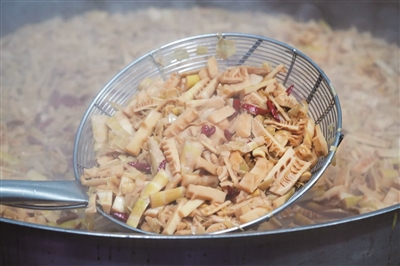 一口大锅,一次能烤上百斤笋,其间灶膛里柴火不能断。大火、中火交替转换,全凭老师傅的经验拿捏。调味后的油焖笋,需要不时用大铲子翻动,确保上下熟透一致,还得盯着别糊锅。这个过程中,酱汁一点一点被笋吸收,咸香慢慢沁入每一寸笋肉。
