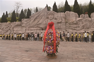 4月2日,广西全州县在红军长征湘江战役纪念园举行“清明祭英烈·薪火永相传”祭扫活动,祭奠红军英烈。1934年底,为确保中共中央和中央红军主力渡过湘江,粉碎敌人围歼红军于湘江以东的企图,几万名红军将士血染湘江两岸。湘江战役结束后,中央红军从长征开始时的8.6万人减至3万余人,无数英烈埋骨桂北大地。这是在纪念园凭吊广场,人们在列队给红军英烈献花。
