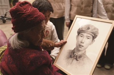 4月1日,红军烈士钟延柱的女儿钟新娣手捧父亲的画像。清明节前,安徽师大等多所高校的学生为长征路上牺牲的100多位瑞金籍烈士创作画像并赠送给烈属。90多年后,这些掩埋在战场上的年轻脸庞终于再次被故乡的亲人们看见。活动牵头人叶庆华说,很多烈士后代不知道先辈的模样,唯有乡亲口头的一句“你和你爸很像”。为了弥补这个遗憾,2021年起,叶庆华联系10所院校师生,用手绘、AI绘画等形式为烈士画像。