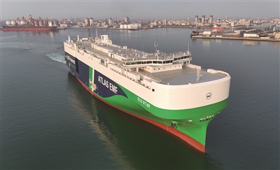 4月2日,7000车位双燃料汽车运输船“洁能之星”轮在山东烟台港龙口港区投入运营。该船配备液化天然气(LNG)动力系统,同时采用“氨预留”设计,可在升级改装后使用清洁的氨燃料。这是“洁能之星”轮从烟台港龙口港区起航(无人机照片)。