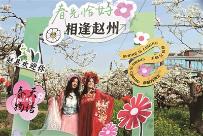 4月2日,外籍游客在河北省石家庄市赵县(古称赵州)谢庄镇梨园游玩拍照。清明时节,我国大部分地区春暖花开、莺飞蝶舞,正是踏青出游之时。北宋理学家程颢的诗句“况是清明好天气,不妨游衍莫忘归”描绘了人们纷纷走出家门,享受美好春光的景象。