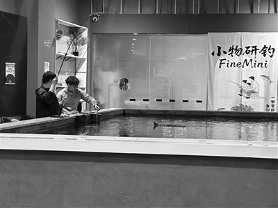 在“小物研钓”门店,钓鱼爱好者正在体验室内“小物钓”。