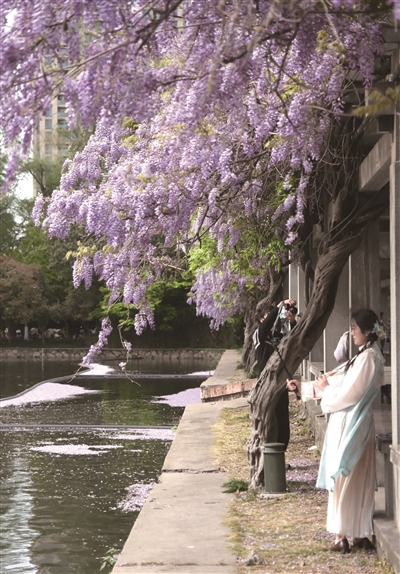 近日,浙江大学华家池校区的“紫藤长廊”上线了!紫藤长廊位于华家池畔西侧,呈南北向横亘于华家池与东滩之间,建于20世纪80年代,长约140米,堤上有一座石拱桥,使东西华家池相连。因两侧种植了紫藤,每到初夏,盛开的紫藤花挂满了整个长廊。图为昨日,市民在“紫藤长廊”打卡拍照。