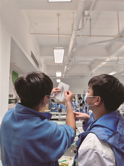 两个下午,校园里热闹非凡:生物实验室里,学生们正埋头与树叶“较劲”——强碱煮软的叶子,用小牙刷一点点刷掉叶肉,制作叶脉书签;教室里,安静得只剩笔尖沙沙声,数独答题正在进行;物理实验室中,两位男生在调试制作电磁炮;阶梯教室里,歌声阵阵,那是同学们在唱自己改编的地理歌曲……