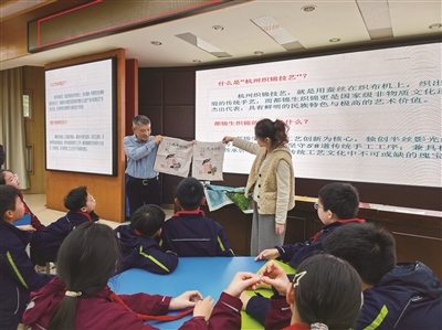 这是由中共杭州市委宣传部(杭州市文明办)主办、每日商报承办的杭州市“第二课堂优秀课程进校园”的活动现场,来自都锦生织锦博物馆的苗雨痕,为青蓝青华实验小学五年级学生带来都锦生织锦的爱国创业发展史,并现场展示了杭州织锦的代表性作品。