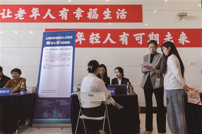 4月9日,上海市养老服务人才专场就业与实习招聘会在上海工程技术大学松江校区举行,近50家养老服务机构及企业提供覆盖机构管理、专业社工、行政后勤、专技人员、医护人员等多个领域的百余个岗位。这是求职者在招聘会现场与招聘方代表沟通。