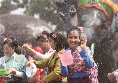4月10日,在泰国大城府,人们与大象互相“泼水”,迎接即将到来的宋干节。