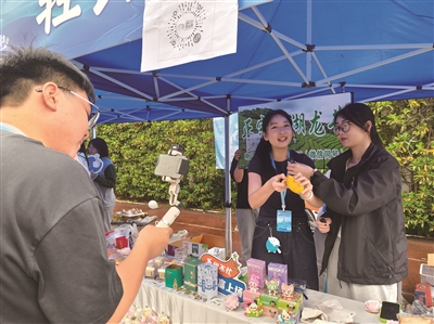 现场,各校区的班级都设了实体摊位,同时,以直播探店的形式,每个班有5分钟的时间,介绍自己的店铺产品,靠问答互动、现场品尝来招揽顾客。国商241班的邵一涵刚对着直播镜头介绍完自己班级的店铺,“我们主要卖水果、零食还有需要自己动手搭建的乐高等。”她告诉记者,班里统筹策划的有13个人,实际参与的有将近半个班。