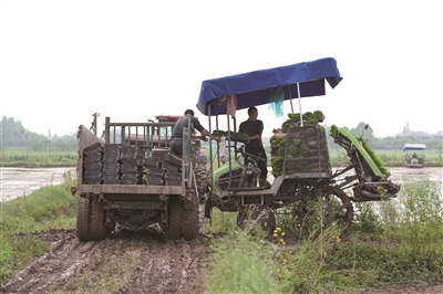 4月16日,在湖南省益阳市南县南洲镇,工人将早稻秧苗转运至插秧机上。近期,湖南洞庭湖畔多地陆续开启早稻插秧。在益阳市南县南洲镇,多台无人驾驶插秧机在田间穿梭作业。这些无人驾驶插秧机具备实时定位与路径规划能力,能够节省人工劳力,使插秧作业更加规范、高效,便于田间管护。