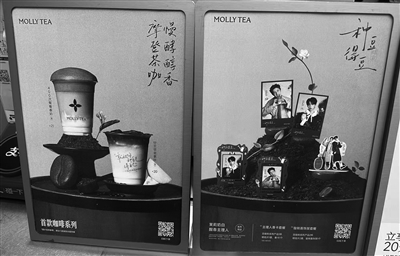 在茶饮品牌店,首款咖啡系列展示牌摆放在点单台上。