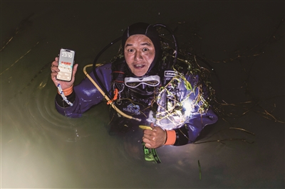 “有时候一下水就找到了,慢的时候找几小时也有可能。通常作业水深不超过5米,8米左右就算比较深了,最深一次潜到20多米。”