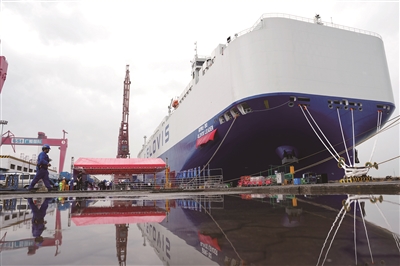 4月28日,一名工作人员从刚交付的运输船旁走过。当日,中船广船国际联合中船贸易为韩国HMM航运建造的全球首艘10800车汽车运输船(PCTC)“格罗唯视 领航”轮在广州南沙命名交付。该船单船最大装车量达10800辆,刷新全球同类船舶运力纪录,标志着我国高端船舶制造能力实现新突破,为全球航运业绿色低碳转型提供了“中国方案”。
